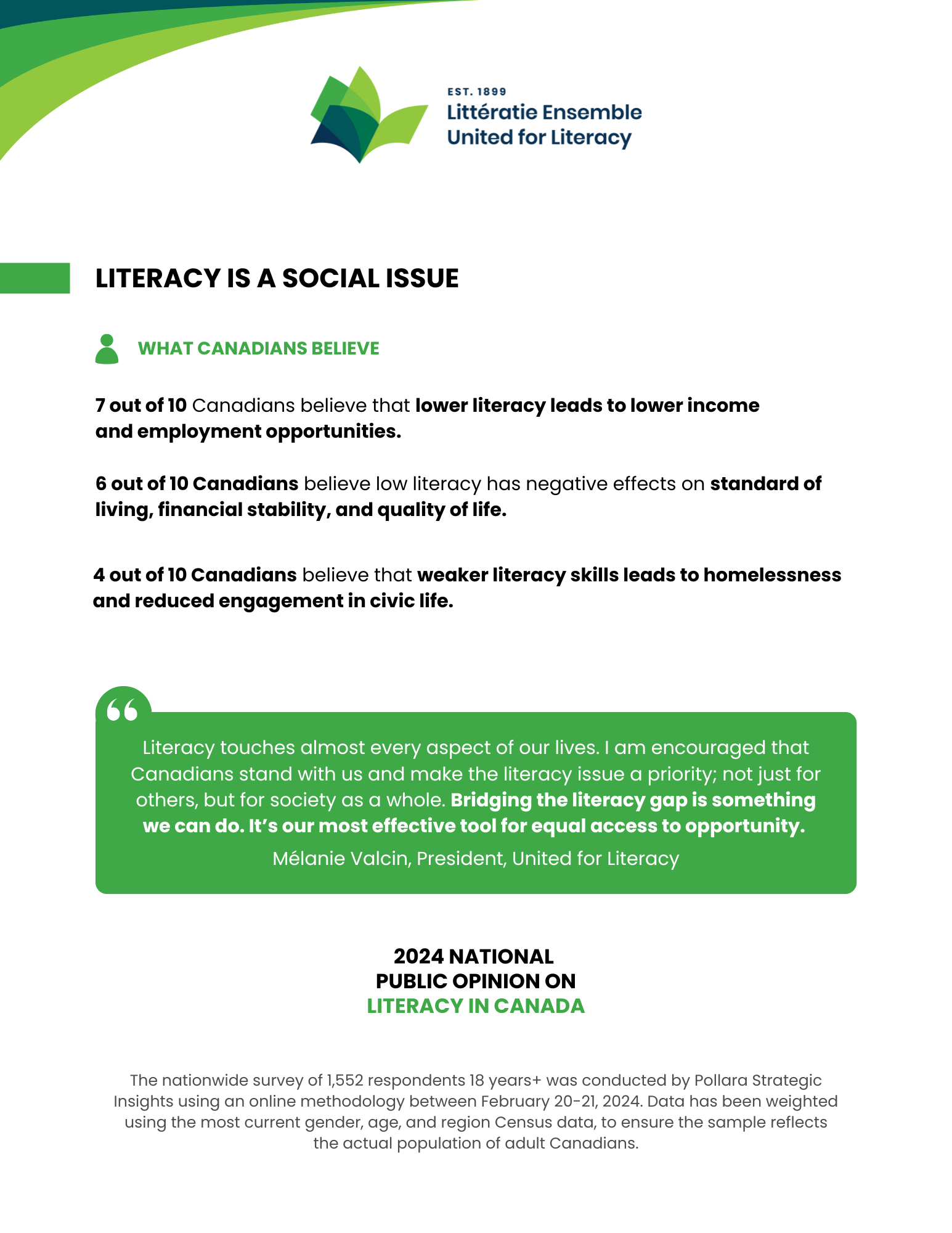 The nationwide survey of 1,552 respondents 18 years+ was conducted by Pollara Strategic Insights using an online methodology between February 20-21, 2024. Data has been weighted using the most current gender, age, & region Census data, to ensure the sample reflects the actual population of adult Canadians.